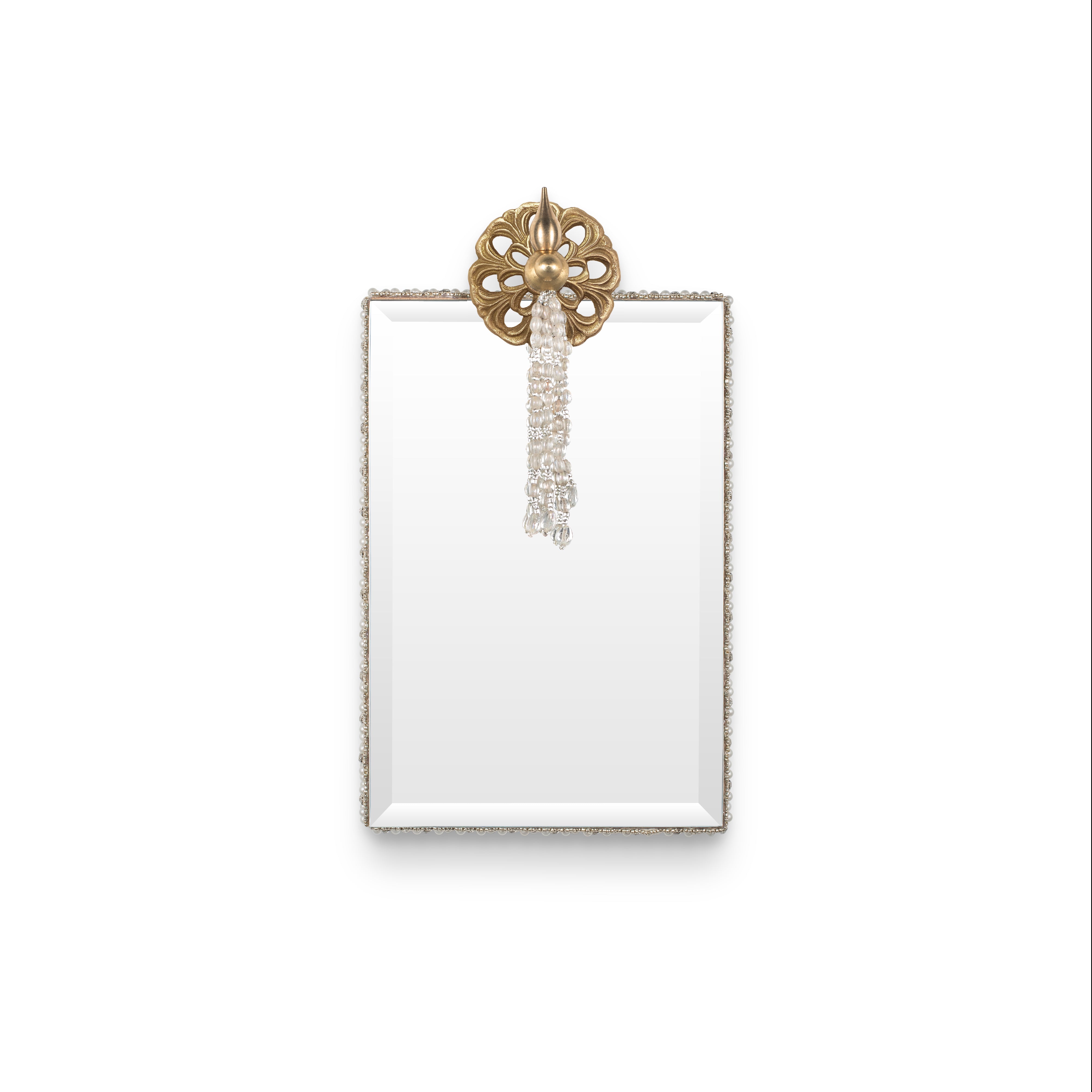 The enchanting influence of Art Deco at its finest within the graceful accoutrement of this versatile mirror touting an exceptional combination of solid brass, wood, and glass beads. Edged with a detailed and elegant border our Erte adds dimension, depth and beauty as a cascading grouping or as a single focus in a precious nook in need of an appealing piece.